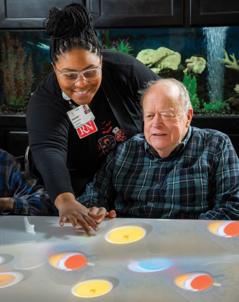 Options for resident engagement now include games from a specialized console called the Tovertafel. This device, known by staff as the “Tover,” is a special projector mounted to the ceiling that sends interactive light projections onto a table. Its interactive games are proven to support cognitive, physical, sensory and social function in persons with dementia.